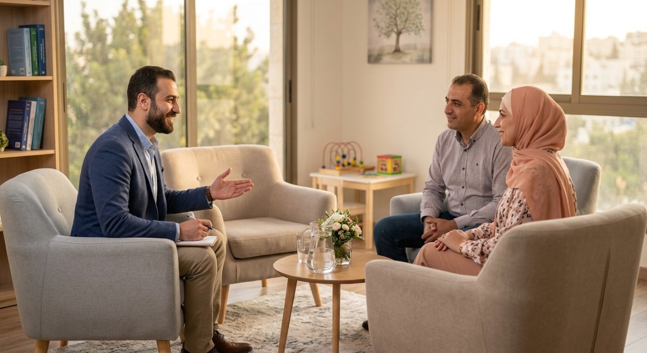 خلق مساحة ترحيبية نفسية: اختيار الموقع الذي يوفر الهدوء والخصوصية التامة، بحيث يشعر الوالدان بالقبول والأمان بعيدًا عن أي أحكام مسبقة؛ لتعزيز شعورهم بالدعم والقدرة على التحدث بحرية.